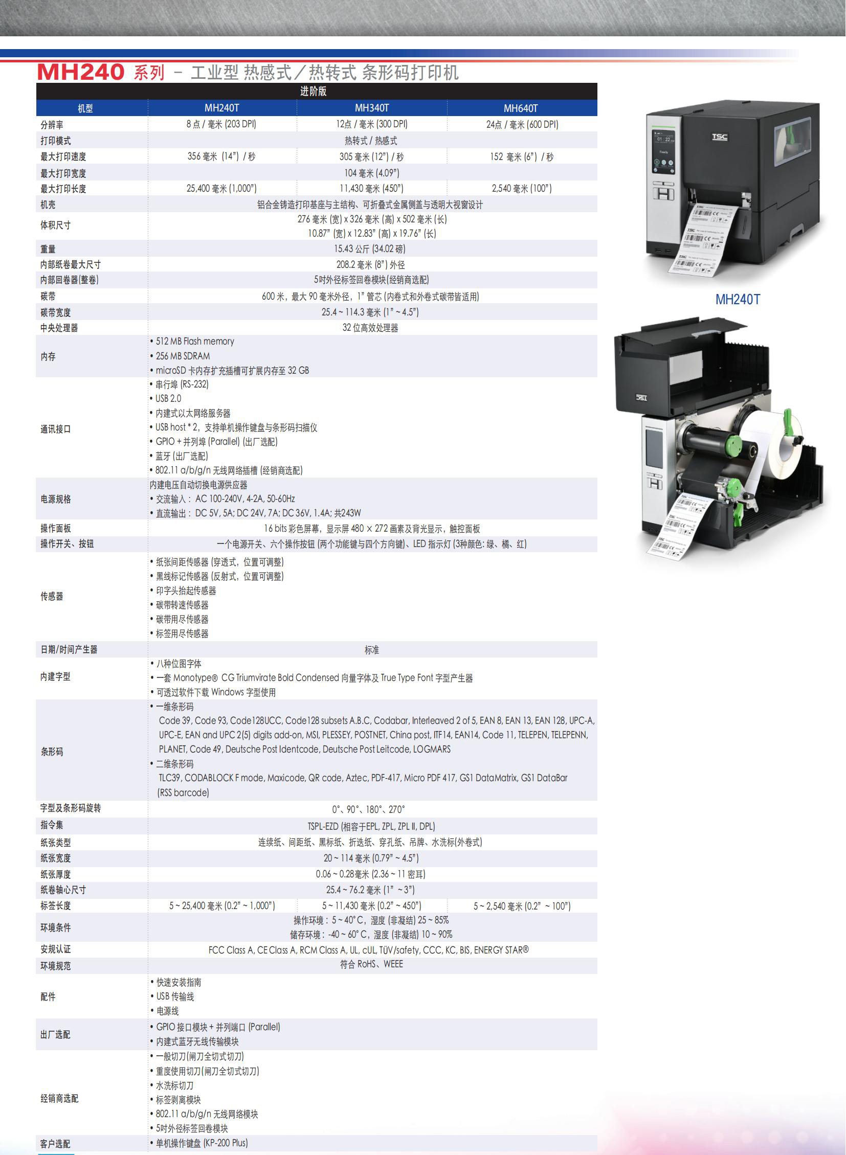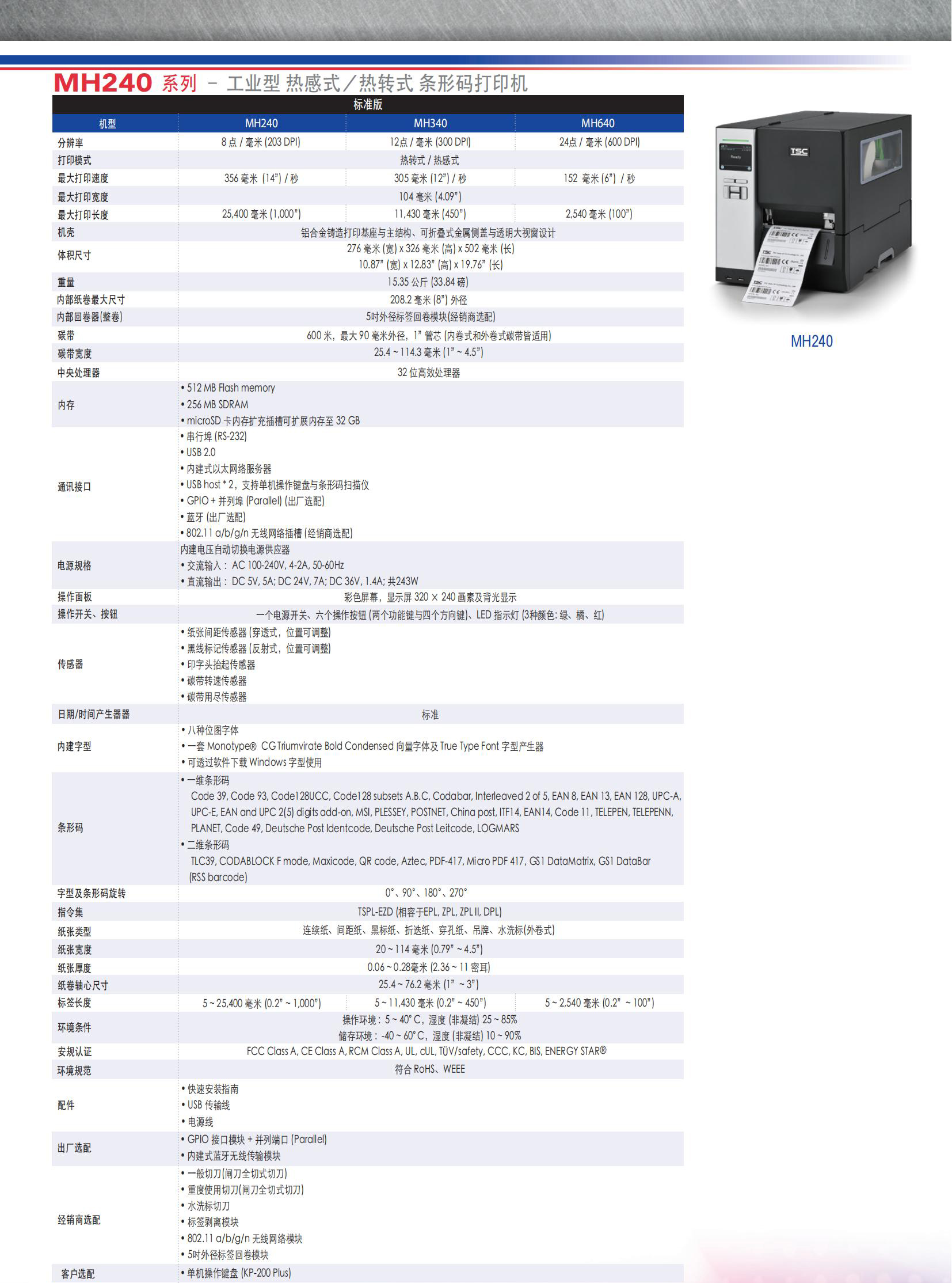 TSC-MH240 系列 – 工业型 热感式/热转式 条形码打印机