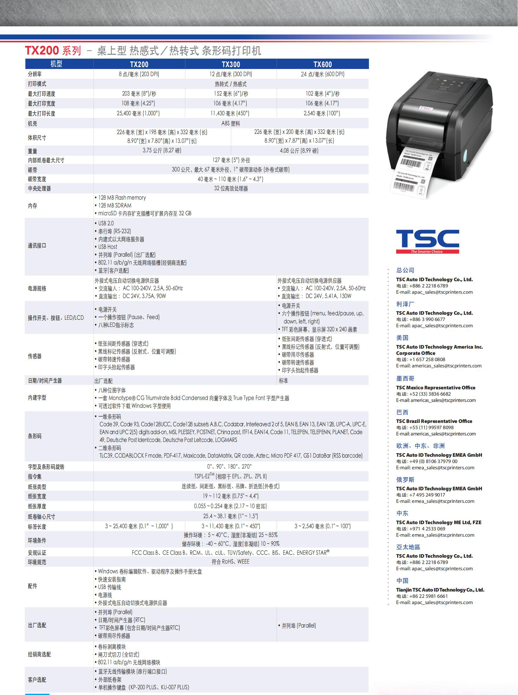 TSC-TX200 系列 – 桌上型 热感式/热转式 条形码打印机